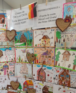 Inspirée par ce « cadeau » de nos amis de Gerstetten, la pâtisserie de Noël a été choisie comme thème de l’édition 2025 du marché, particulièrement à destination des enfants. Ce motif figurait sur les flyers, les roll-ups, et les stickers distribués aux plus jeunes. Autour de ce thème, plusieurs actions ont été menées : en collaboration avec des enseignants des écoles primaires, un membre du comité s’est rendu dans les classes pour initier un échange épistolaire avec des écoliers allemands et raconter aux élèves français le conte Hänsel et Gretel, célèbre pour sa maison en pain d’épices. Des dessins réalisés par les enfants ont ensuite été exposés à l’entrée du Sémaphore pendant le marché. Par ailleurs, une véritable maison en sucrerie, présentée sur le stand allemand, constituait le premier prix d’un quiz consacré aux frères Grimm et au jumelage.